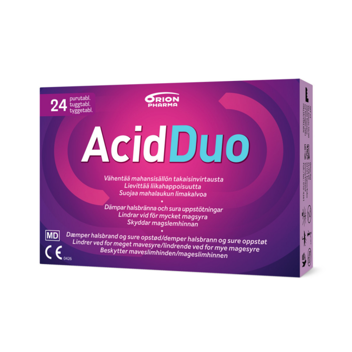Acidduo lievittää mahan liikahappoisuutta ehkäisten närästystä, vatsakipua ja happamuuteen liittyviä ruoansulatusvaivoja. Acidduo valmistetta voi myös käyttää gastriitin (mahalaukun limakalvon tulehduksen, ns. mahakatarrin) tukihoitona.