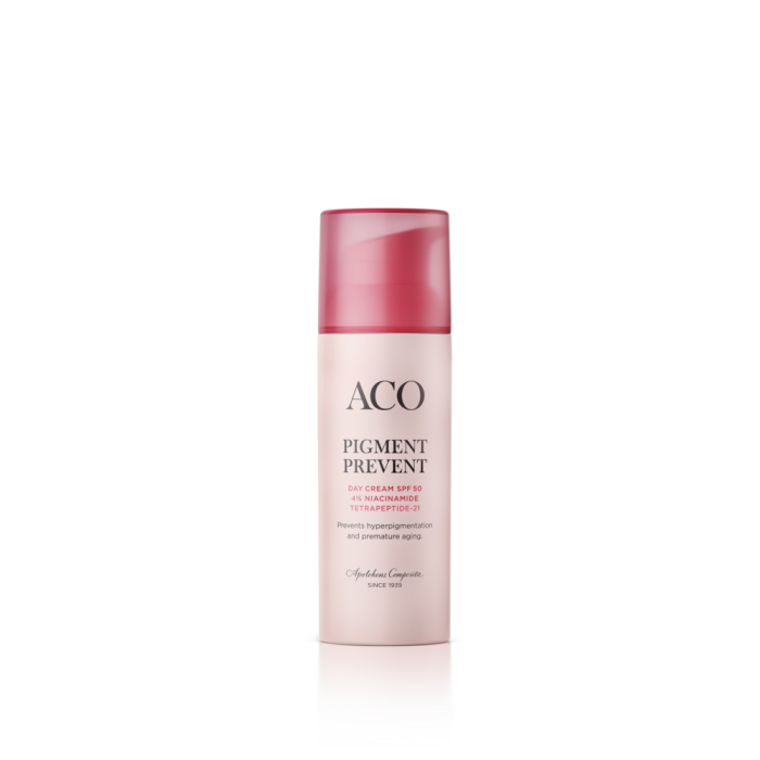 Kattavasti pigmenttimuutoksia ehkäisevä, suojakertoimellinen päivävoide ikääntyvälle iholle. ACO Face Pigment Prevent Day Cream SPF50 hajustettu 50 ml ehkäisee auringolle altistumisen, hormonaalisten muutosten ja ikääntymisen aiheuttamia tummia jälkiä ja maksaläiskiä iholla.