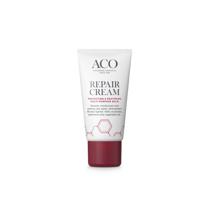 ACO Repair Cream on suojaava ja korjaava erikoisvoide vartalon ja kasvojen erittäin kuiville ihoalueille. Tässä erikoisvoiteessa on korkea rasvapitoisuus ja se muodostaa suojakerroksen kuivalle, karhealle ja vaurioituneelle iholle. Sillä on myös kosteuttava ja rauhoittava vaikutus ja se korjaa kuivaa ihoa. Sen on kliinisesti todistettu tukevan ihon omaa korjausprosessia ja vahvistavan ihon suojakerrosta. Syväkosteuttaa koko päivän ja jättää ihon pehmeäksi ja sileäksi ja antaa sille miellyttävän tunteen Dermatologisesti testattu. Voidaan käyttää aikuisille, lapsille ja vauvoille. Sopii herkälle iholle. Hajusteeton.