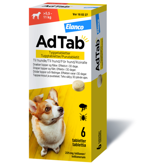 AdTab purutabletit koiralle on tarkoitettu koiran kirppu- ja puutiaistartuntojen hoitoon, sikaripunkkitartuntojen hoitoon ja osana hoitosuunnitelmaa kirppujen aiheuttaman allergisen ihotulehduksen hallinnassa. Kirppujen ja puutiaisten täytyy kiinnittyä isäntään ja aloittaa syöminen, jotta ne altistuvat vaikuttavalle aineelle. Vaikuttava aine on lotilaneeri. Ei alle 8 viikon ikäisille koiranpennuille eikä alle 1,3 kg painoisille koirille.