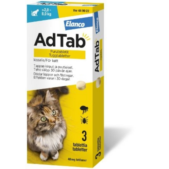 AdTab purutabletit kissalle on tarkoitettu kissan kirppu- ja puutiaistartuntojen hoitoon ja osana hoitosuunnitelmaa kirppujen aiheuttaman allergisen ihotulehduksen hallinnassa. Kirppujen ja puutiaisten täytyy kiinnittyä isäntään ja aloittaa syöminen, jotta ne altistuvat vaikuttavalle aineelle. Vaikuttava aine on lotilaneeri. Ei alle 8 viikon ikäisille kissanpennuille eikä alle 0,5 kg painoisille kissoille.