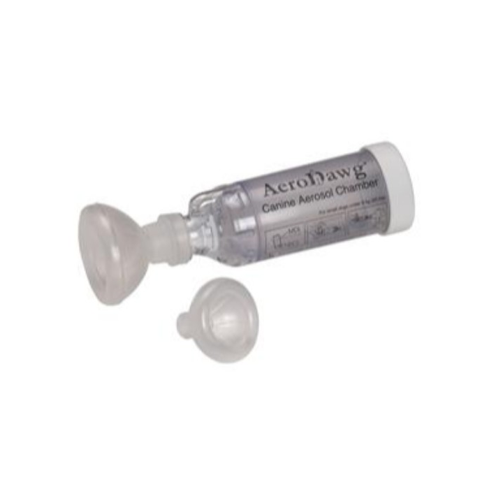 AeroDawg Canine on inhalaatiomaski koirien lääkkeelliseen hoitoon hengitysongelmien ja kroonisen bronkiitin hoitoon. S ja M koot. Koirille 10 kg saakka.