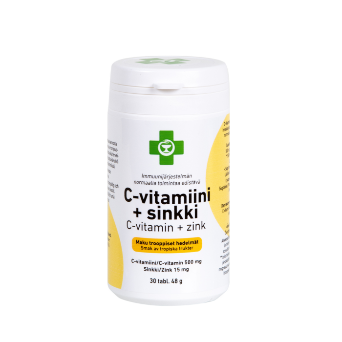 Raikas imeskeltävä C-vitamiini-sinkkivalmiste vastustuskyvyn tueksi. Makuna trooppiset hedelmät. Ei sisällä eläinperäisiä ainesosia. Laktoositon, hiivaton, gluteeniton. Valmistettu Suomessa.
