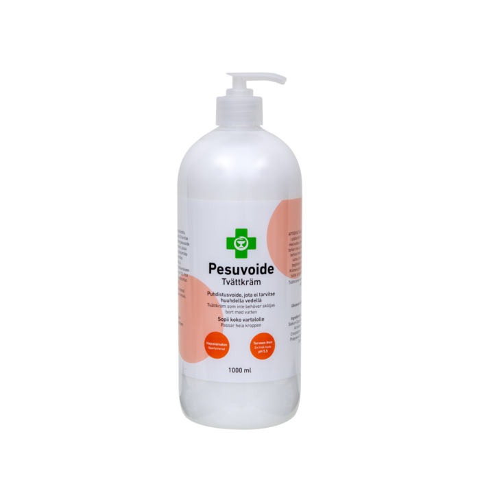 APTEEKKI Pesuvoide on tarkoitettu käytettäväksi saippuan sijasta. Ei tarvitse huuhdella vedellä. Hajustamaton pesuvoide ei kuivata ihoa. Sopii tilanteisiin, joissa tarvitaan usein toistuvaa puhdistamista ilman vesipesua, esimerkiksi liikkumisrajoitteisille ja inkontinenssipotilaiden ihon hellävaraiseen puhdistukseen. Terveen ihon pH 5,5. Ihoa kosteuttava ja pehmentävä koostumus. Rasvapitoisuus 5 %.