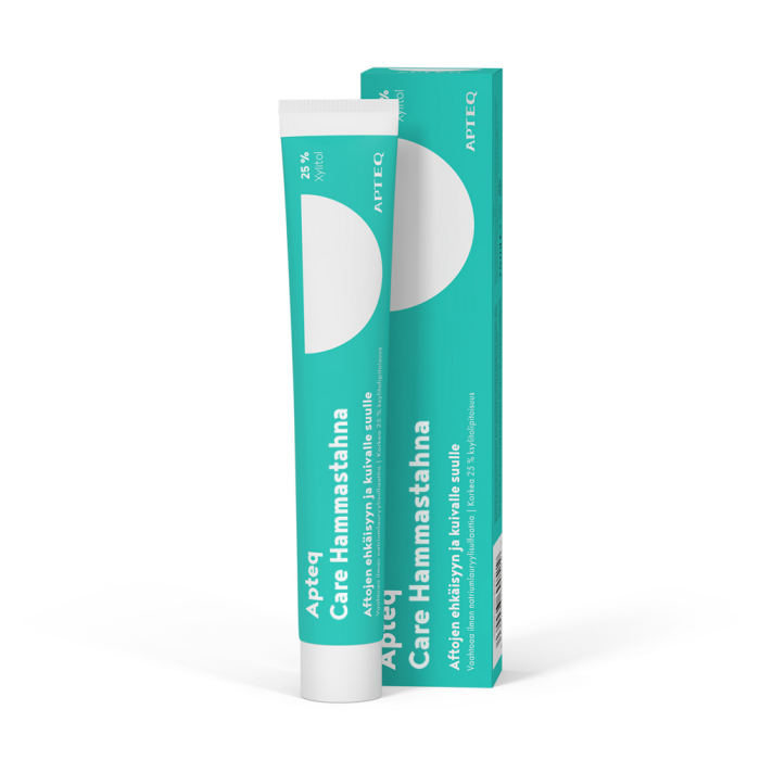Apteq hoitava hammastahna on kuiva- ja herkkäsuisille kehitetty hammastahna, joka sopii erityisen hyvin aftojen ehkäisyyn. Suuri 25 % ksylitolipitoisuus estää kariesta aiheuttavien mutans streptokokki -bakteerien toimintaa, lisää syljen eritystä ja estää syljen pH:n laskua.