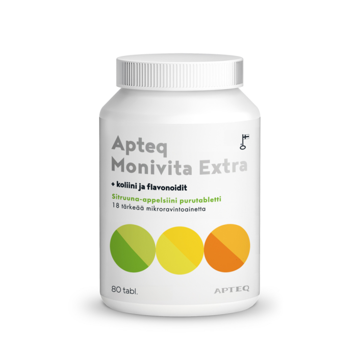 Apteq Monivita Extra on hyvänmakuinen monivitamiinipurutabletti, jossa on mukana laaja kirjo vitamiineja ja hivenaineita! Nyt mukana myös kliinisesti tutkitut suojaravintoaineet koliini ja flavonoidit.