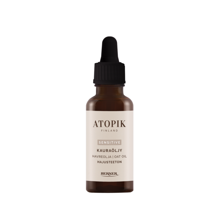 Hajusteeton kasvoöljy kuivalle ja herkälle iholle. Rauhoittava Kauraöljy sisältää hoitavia lipidejä, omega-rasvahappoja ja luonnollisia vitamiineja, jotka ravitsevat tehokkaasti kuivaa, ärtynyttä ja herkistynyttä ihoa. Kauraöljyn ihoidenttiset aineet sekä keramidit vahvistavat ihon suojakerrosta ja tukevat sen luonnollista toimintaa. Voidaan käyttää kasvoöljynä yksinään, sekoitettuna kasvovoiteeseen tai hoitorutiinin viimeisenä vaiheena. Vedetön koostumus suojaa ihoa myös kylmän ilman rasitukselta. Hajusteeton. Dermatologisesti testattua luonnonkosmetiikkaa. Vegaaninen. Atopik Sensitive -hoitolinja on suunniteltu erittäin kuivalle ja herkistyneelle iholle. Hajusteettomat, hellävaraiset koostumukset sisältävät ihoa rauhoittavia ja kosteuttavia ainesosia, kuten suomalaista kauraa ja prebiootteja, jotka tukevat ihon luonnollista suojamuuria.