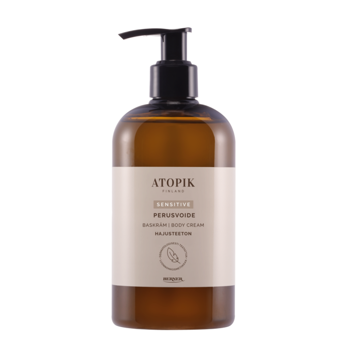 Hajusteeton, kevyt perusvoide kuivalle ja herkälle iholle. Nopeasti imeytyvä koostumus kosteuttaa tehokkaasti ja tukee ihon luonnollista tasapainoa. Voide sisältää ihoa hoitavia ja pehmentäviä ainesosia sekä ihoidenttisiä aktiiviaineita, kuten keramideja ja prebiootteja, jotka vahvistavat ihon suojamuuria ja rauhoittavat ärtynyttä ihoa. Sopii koko perheen päivittäiseen käyttöön kasvoille ja vartalolle. Hajusteeton. Dermatologisesti testattua luonnonkosmetiikkaa. Vegaaninen. Atopik Sensitive -hoitolinja on suunniteltu erittäin kuivalle ja herkistyneelle iholle. Hajusteettomat, hellävaraiset koostumukset sisältävät ihoa rauhoittavia ja kosteuttavia ainesosia, kuten suomalaista kauraa ja prebiootteja, jotka tukevat ihon luonnollista suojamuuria.