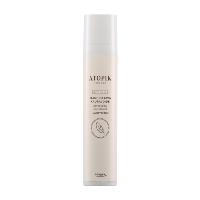 Hajusteeton, täyteläinen kasvovoide kuivalle ja herkälle iholle. Voide sisältää prebiootteja, keramideja, kaurauutetta ja kauraöljyä, jotka yhdessä tukevat ihon hyvinvointia ja kosteustasapainoa. Hoitavat ja ravitsevat ainesosat pehmentävät ihoa, vähentävät kiristävää tunnetta ja auttavat rauhoittamaan ärtynyttä ihoa. Kauravoiteen sisältämät ihoidenttiset aktiiviaineet tukevat ihon luonnollista toimintaa ja saavat ihon näyttämään hyvinvoivalta. Sopii erinomaisesti päivittäiseen käyttöön aamuin illoin. Hajusteeton. Dermatologisesti testattua luonnonkosmetiikkaa. Vegaaninen. Atopik Sensitive -hoitolinja on suunniteltu erittäin kuivalle ja herkistyneelle iholle. Hajusteettomat, hellävaraiset koostumukset sisältävät ihoa rauhoittavia ja kosteuttavia ainesosia, kuten suomalaista kauraa ja prebiootteja, jotka tukevat ihon luonnollista suojamuuria.