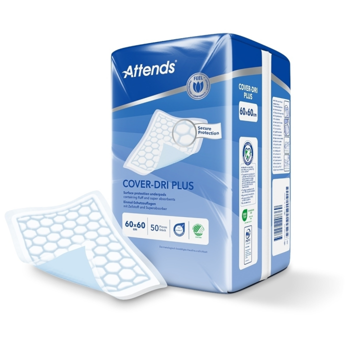 Vuoteensuoja Attends Cover-Dri Plus 60 x 60 cm. Pehmeä ihoystävällinen pintakerros. Imuosan sellussa heksagonikuviointi sekä superabsorbentti. Valmistustettu Ruotsissa.