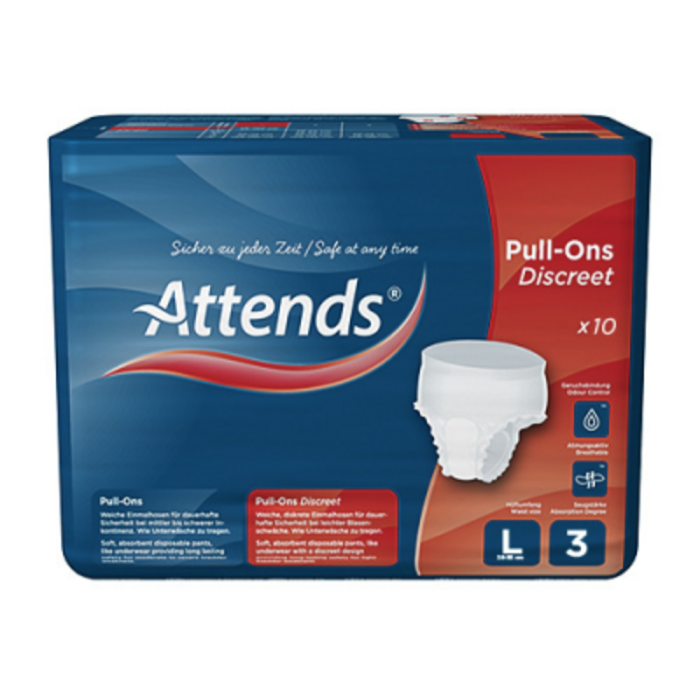 Housuvaippa Attends Pull Ons Discreet 3L. Lievään tai keskivaikeaan inkontinenssiin. Alushousumaisissa inkohousuissa yhdistyvät imukykyinen vaippa ja alushousut. Aktiiviseen ja omatoimiseen elämäntyyliin. Helppo pukea ja riisua. Taustapinta pehmeä ja hengttävä, erityisen huomaamaton. Valmistettu Ruotsissa.