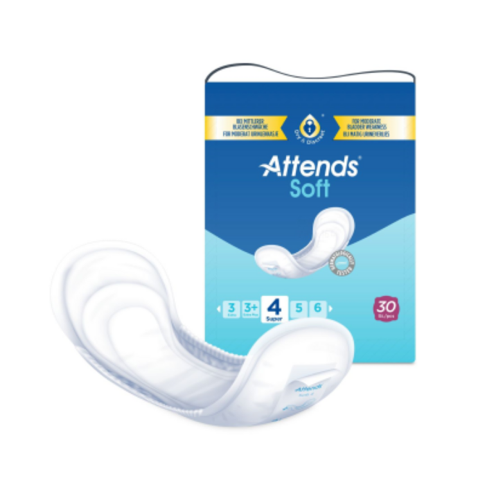 Sekä naisille että miehille sopiva tippasuoja Attends Soft 4 Super. Vaikeaan inkontinenssiin, pituus 39,5 cm. Ohut ja huomaamaton. Quick Dry -imuydin ja Odour Protection -hajunestojärjestelmä. Kaksi teippiraitaa. Sopii käytettäväksi normaalien alushousujen kanssa. Valmistusmaa Ruotsi.