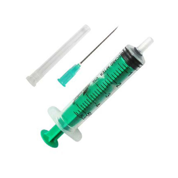 Kertakäyttöinen ruisku ja neula. Steriili, pyrogeeniton.