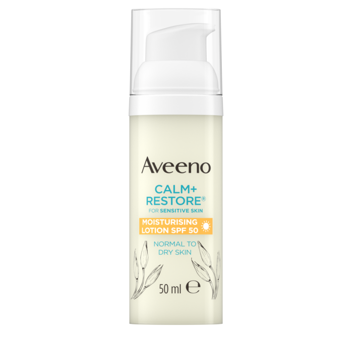 Aveeno Calm+Restore Moisturising Lotion SPF50, hajustamaton ja kevyt, päivittäiseen käyttöön sopiva kosteusvoide aurinkosuojakertoimella SPF50 kosteuttaa tehokkaasti ja rauhoittaa herkkää ihoa, suojaten samalla auringon haitoilta sekä ilmansaasteilta. Kevyt koostumus sisältää ravitsevaa kauraa, joka auttaa rauhoittamaan ihoa ja säilyttämään sen kosteussuojan, rauhoittavaa reunuspietaryrttiä, joka tunnetaan antioksidanttisista ominaisuuksistaan, sekä hyaluronihappoa, joka auttaa sitomaan kosteutta. Se levittyy iholle helposti ja huomaamattomasti, jättäen ihon terveen ja säteilevän näköiseksi.