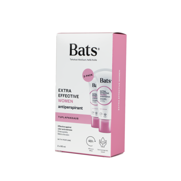 Bats Roll-on Women 2x60ml kampanjapakkaus. Bats Roll-on Woman antiperspirantti ehkäisee tehokkaasti kainaloiden hikoilua ja hienhajua. Se kuivuu nopeasti ja on lempeä iholle.