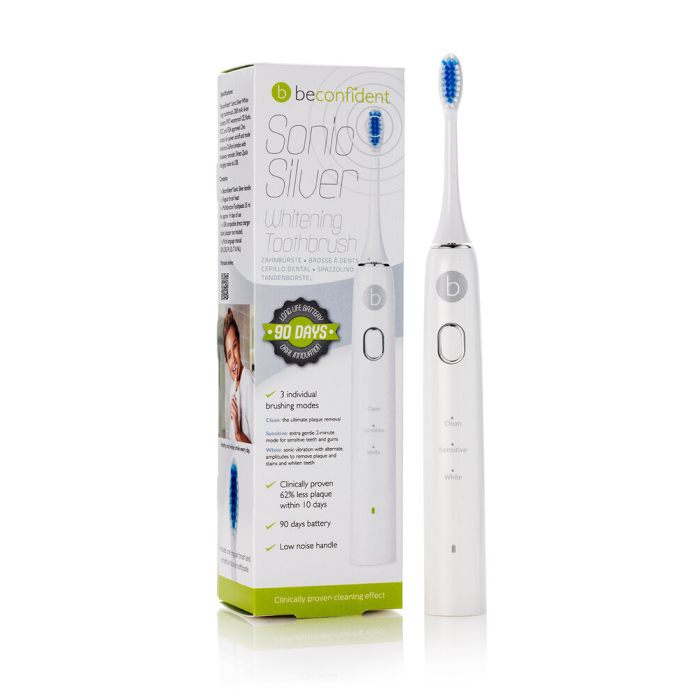 Beconfident® Sonic Silver -hammasharja poistaa plakkia 62 % paremmin kuin manuaalinen hammasharja. Sonic Silver -sähköhammasharjan ultraäänivärinä luo parempaa puhdistustehoa, joka auttaa poistamaan plakkia myös sieltä, mihin harjakset eivät yllä. Tämä auttaa poistamaan tummentumia ja valkaisemaan hampaita. Sonic Silver -hammasharjassa on kolme erilaista harjausohjelmaa: puhdistus, hellävarainen ja valkaisu. Peräti 3 kuukauden akun kesto yhdellä latauksella.