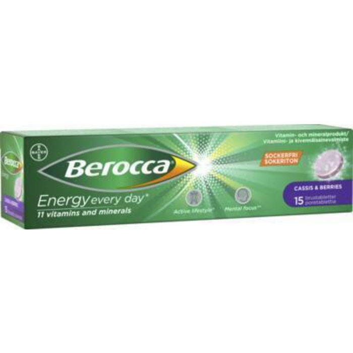 Mustaherukan ja vadelman makuinen poretabletti sisältää 11 välttämätöntä vitamiinia ja kivennäisainetta. Berocca Energy Mango-poretabletit sisältävät B-vitamiineja ja C-vitamiinia sekä sinkkiä ja magnesiumia. Nopeasti veteen liukenevien poretablettien sisältämät B2-, B3-, B5-, B12- sekä C-vitamiini ja magnesium auttavat vähentämään väsymystä ja uupumusta. B5-vitamiini edistää normaalia henkistä suorituskykyä. B6-, B9- ja C-vitamiini sekä sinkki edistävät immuunijärjestelmän normaalia toimintaa. B1-, B2-, B3-, B5-, B6-, B7-, B12- ja C-vitamiini ja magnesium edistävät normaalia energia-aineenvaihduntaa.