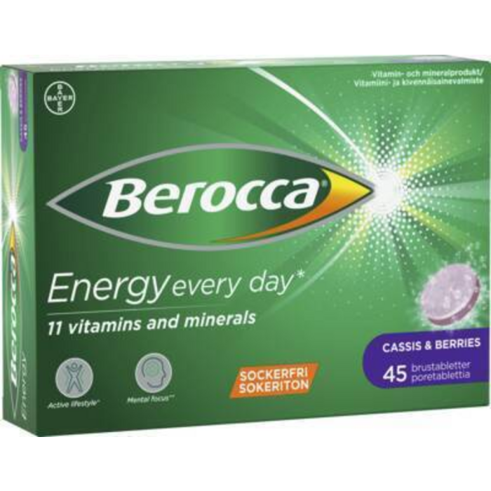 Mustaherukan ja vadelman makuinen poretabletti sisältää 11 välttämätöntä vitamiinia ja kivennäisainetta. Berocca Energy Cassis&Berries poretabletit sisältävät B-vitamiineja ja C-vitamiinia sekä sinkkiä ja magnesiumia. Nopeasti veteen liukenevien poretablettien sisältämät B2-, B3-, B5-, B12- sekä C-vitamiini ja magnesium auttavat vähentämään väsymystä ja uupumusta. B5-vitamiini edistää normaalia henkistä suorituskykyä. B6-, B9- ja C-vitamiini sekä sinkki edistävät immuunijärjestelmän normaalia toimintaa. B1-, B2-, B3-, B5-, B6-, B7-, B12- ja C-vitamiini ja magnesium edistävät normaalia energia-aineenvaihduntaa. Liuota yksi tabletti vesilasilliseen ja nauti hyvänmakuisesta juomasta. Sopii vegaaneille. Ei sisällä kofeiinia. Sokeriton.