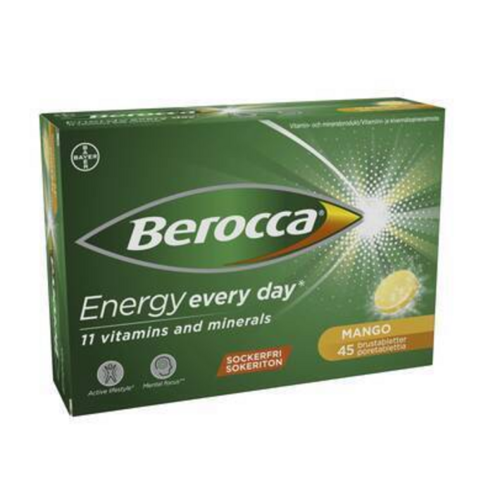 Herkullisen mangon makuinen poretabletti sisältää 11 välttämätöntä vitamiinia ja kivennäisainetta. Berocca Energy Mango-poretabletit sisältävät B-vitamiineja ja C-vitamiinia sekä sinkkiä ja magnesiumia. Nopeasti veteen liukenevien poretablettien sisältämät B2-, B3-, B5-, B12- sekä C-vitamiini ja magnesium auttavat vähentämään väsymystä ja uupumusta. B5-vitamiini edistää normaalia henkistä suorituskykyä. B6-, B9- ja C-vitamiini sekä sinkki edistävät immuunijärjestelmän normaalia toimintaa. B1-, B2-, B3-, B5-, B6-, B7-, B12- ja C-vitamiini ja magnesium edistävät normaalia energia-aineenvaihduntaa. Liuota yksi tabletti vesilasilliseen ja nauti hyvänmakuisesta juomasta. Sopii vegaaneille. Ei sisällä kofeiinia. Sokeriton. Ravintolisä.