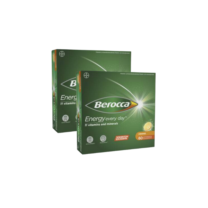 Berocca Energy tukee aivojen toimintaa 3) ja auttaa sinua pysymään hyvässä vireessä joka päivä 1). Poretabletit liukenevat nopeasti veteen ja sisältävät 11 välttämätöntä vitamiinia ja kivennäisainetta, mukaan lukien useita B-vitamiineja: B1- ja B2-vitamiinit auttavat vapauttamaan energiaa ruoasta, B3- ja B6-vitamiinit vähentävät väsymystä ja B5-vitamiini tukee henkistä suorituskykyä. Magnesiumin avulla taistelet väsymystä vastaan ja magnesium tasapainottaa elektrolyyttejä. C-vitamiini vahvistaa immuunijärjestelmää. Yksi sokeriton, appelsiinin makuinen poretabletti auttaa vapauttamaan luonnollista energiaa 2), jotta pysyt hyvässä vireessä joka päivä 1). Liuota yksi tabletti vesilasilliseen ja nauti hyvänmakuisesta juomasta. Berocca Energy soveltuu aikuisille ja vähintään 12-vuotiaille sekä vegaaneille. Berocca Energy ei sisällä kofeiinia ja se on gluteeniton. RAVINTOLISÄ. Ravintolisiä ei pidä käyttää monipuolisen ruokavalion ja terveellisten elämäntapojen korvikkeena. Bayer Oy 1)B2-, B