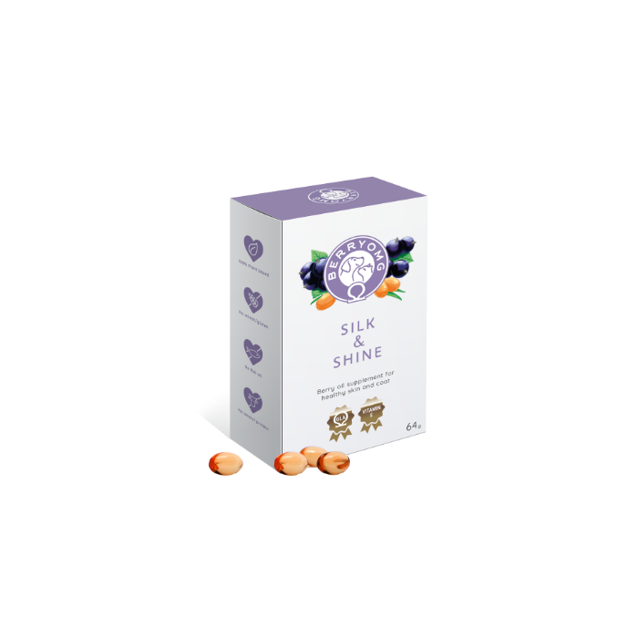BERRYOMG® Silk & Shine on valmistettu mustaherukan siemenöljystä ja tyrniöljystä. Mustaherukan siemenöljy sisältää omega-6- ja omega-3-rasvahappoja, jotka vahvistavat ihon suojakerrosta ja vähentävät kuivuutta ja kutinaa. Tyrniöljy puolestaan sisältää harvinaisempaa omega-7-rasvahappoa, joka tukee ihon ja limakalvojen hyvinvointia. Tuotteessa on myös ihonhyvinvoinnille tärkeää E-vitamiinia sen luonnollisessa muodossa. Tuotteen rasvahappokoostumuksesta voi olla hyötyä, jos koiran iho-ongelmiin liittyy karvanlähtöä, hilseilyä tai hiivatulehduksia.