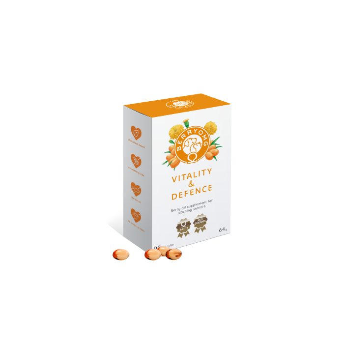 BERRYOMG® Vitality & Defence on koirille ja kissoille tarkoitettu, täysin kasvipohjainen ravintolisä, joka on valmistettu tyrniöljystä. Se sisältää ainutlaatuisen koostumuksen omega-3-, -6-, -7- ja -9-rasvahappoja, joilla kaikilla on ihoa suojaavia ja vahvistavia vaikutuksia. Tyrniöljyn sisältämä harvinaisempi omega-7-rasvahappo edistää tunnetusti ihon hyvinvointia sekä limakalvojen kuntoa. Tyrniöljyllä on myös koiran turkin kiiltoa parantavia vaikutuksia.