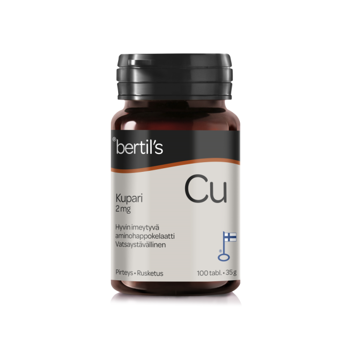Kotimaiset Bertil’s Kupari -tabletit sisältävät vatsaystävällistä aminohappokelatoitua kuparia.