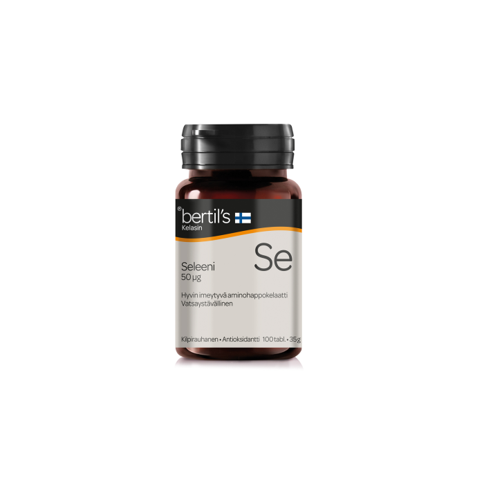 Kotimaiset bertil’s Seleeni -tabletit sisältävät aminohappokelatoitua seleeniä.