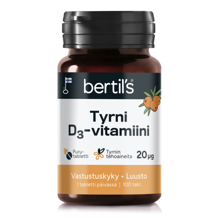 Suomessa kehitetty ja valmistettu raikkaanmakuinen bertil's tyrni-D3-vitamiinipurutabletti.