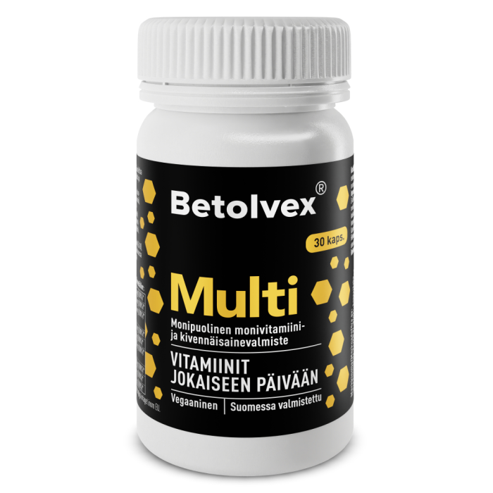 Sisältää suomalaisten ravintosuositusten mukaiset määrät 19 erilaista vitamiinia ja kivennäisainetta. Betolvex Multi on vegaaninen ja Suomessa valmistettu ravintolisä.