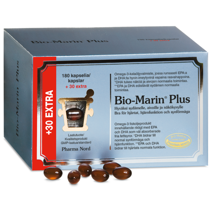 Bio-Marin® Plus – Välttämättömät omega-3-rasvahapot, B12-vitamiini ja foolihappo Sisältää vapaita rasvahappoja, mikä varmistaa paremman imeytyvyyden Vahvaa (65 % omega-3-rasvahappoja), helposti imeytyvää kalaöljyä Sisältää myös B12-vitamiinia ja foolihappoa, jotka edistävät normaalia homokysteiinin aineenvaihduntaa Puhdasta kalaöljyä, joka ylittää selkeästi kaikki turvallisuusrajat Erittäin puhdistettua (kolmivaiheinen puhdistusprosessi, jossa öljy puhdistetaan perusteellisesti) Pehmeät gelatiinikapselit on helppo niellä Valmistettu farmaseuttisten laatuvaatimusten mukaisesti Tieteellisesti testattu