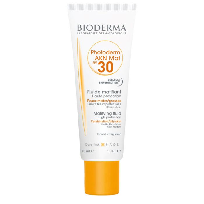 Bioderma Photoderm AKM Mat SPF30 Acne Prone auttaa hillitsemään epäpuhtauksia ja suojaa auringon haitallisilta vaikutuksilta. Miellyttävä väritön koostumus jättää iholle huomaamattoman mattapintaisen, öljyttömän aurinkosuojan. Vedenkestävä. Kemiallinen aurinkosuojafiltteri. Mieto tuoksu. Suojakerroin 30, korkea suoja.