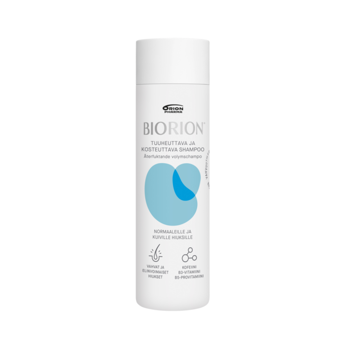 Biorion shampoo on kofeiinia ja B3-vitamiinia sisältävä tuuheuttava sekä kosteuttava shampoo, joka pesee hiukset ja hiuspohjan hellävaraisesti sekä kuivattamatta. Se parantaa hiuspohjan verenkiertoa ja auttaa sitä pysymään elinvoimaisempana.