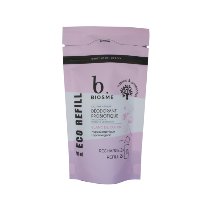 Probioottinen hypoallergeeninen deodorantti. Täyttöpakkaus. Tuoksu: Blanc de cotton - makea manteli Ei sisällä hormonitoimintaa häiritseviä aineita, eteerisiä öljyjä, alkoholia, magnesiumoksidia tai natriumbikarbonaattia. Deodorantti on patentoitu tehokkuutensa ja ainutlaatuisen koostumuksensa vuoksi. Suunniteltu säätelemään hienhajua luonnollisesti ja tehokkaasti. Sopii herkälle iholle. - Koostumus on huolellisesti kehitetty ihoa ja ympäristöä kunnioittavista ainesosista. - Ainesosat tulevat luonnollisista ja orgaanisista lähteistä tinkimättömän tehokkuuden takaamiseksi. - Probiootit: Hyödylliset mikro-organismit auttavat tasapainottamaan ihon bakteerikantaa ja ehkäisevät epämiellyttäviä hajuja. - Vesipohja: Veden käyttö pohjana tekee tuotteesta kevyen ja ärsyttämättömän, ihanteellisen herkälle iholle. 80 ml:n täyttöpakkauksella voit täyttää Biosme Roll-On 50ml:n deodorantin kaksi kertaa (2x40ml).