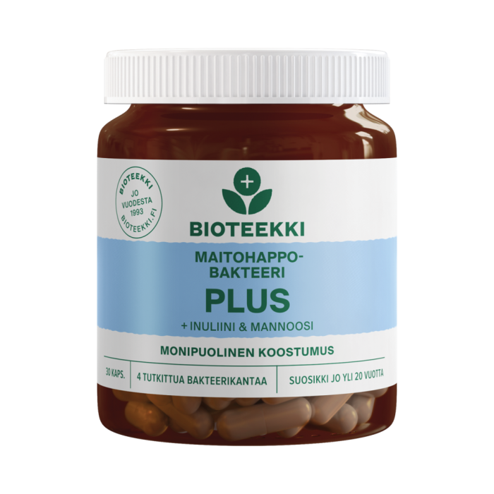 Bioteekki BalanticPro Plus on nyt Bioteekki Maitohappobakteeri Plus! Se on Suomessa jo yli 20 vuoden ajan valmistettu, laadukas maitohappobakteerivalmiste. Tuote sisältää neljää tutkittua maitohappobakteerikantaa. Lisäksi siinä on bakteereiden hyvinvointia tukevia aineita. Bioteekki Maitohappobakteeri Plus sopii käytettäväksi päivittäin tai kuuriluontoisesti ja se soveltuu koko perheelle. Tuotteen kapselikuorilo on kasviperäinen. Kapselin voi tarvittaessa avata ja sekoittaa viileään ruokaan. Tuote saattaa sisältää jäämiä maidosta ja soijasta, jotka ovat peräisin bakteereiden kasvatusliuoksesta. Tuotteella on Valmistettu Suomessa -Avainlippu-tunnus.