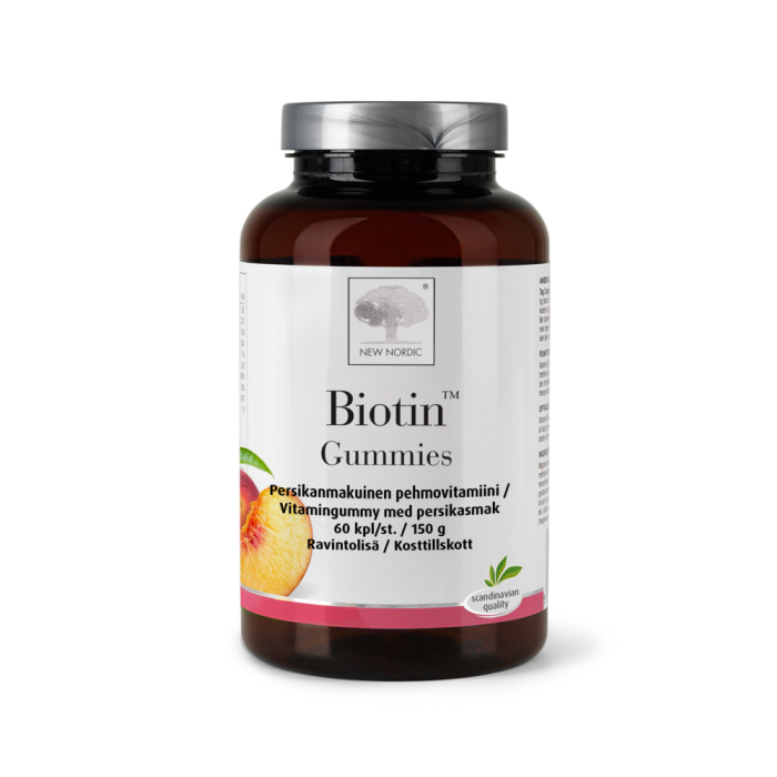 Biotin™ Gummies on herkullisesti persikalta maistuva pehmovitamiini. Biotiini edistää hiusten ja ihon pysymistä normaalina.