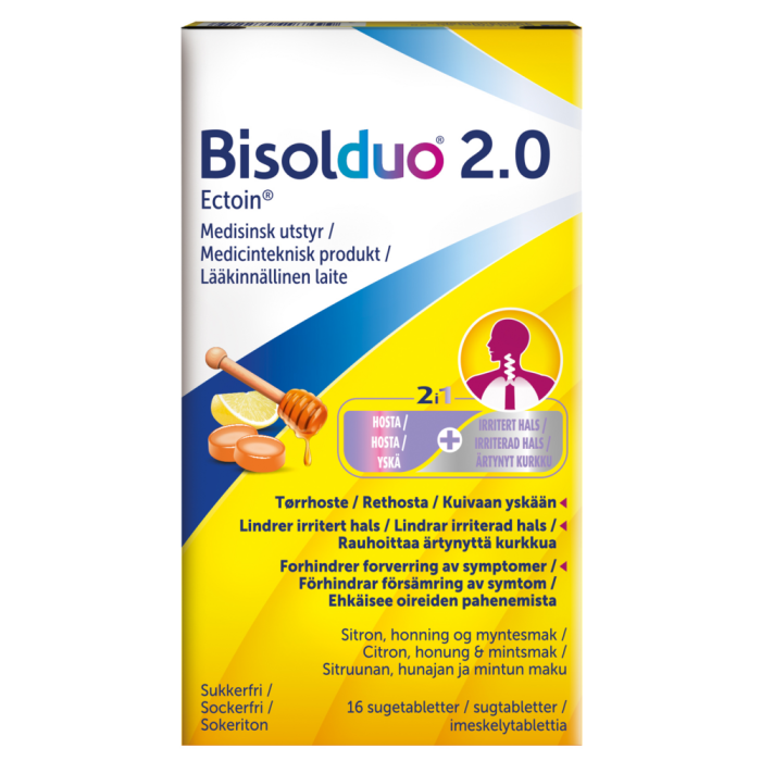 Bisolduo 2.0-imeskelytabletit lievittävät flunssan ensioireita, kuten äänen käheyttä, kuivaa yskää ja nielun ärsytystä, ja ehkäisevät oireiden pahenemista. Sen vuoksi on suositeltavaa aloittaa imeskelytablettien käyttö heti flunssan ensimmäisten merkkien ilmaantuessa. Bisolduo 2.0-imeskelytableteissa on miellyttävä sitruunan, hunajan ja mintun maku. Bisolduo 2.0 on lääkinnällinen laite, joka sisältää soluja suojaavia luonnollisia Ectoin®-molekyylejä, joilla on ärsytystä lievittäviä ja limakalvoa vakauttavia ominaisuuksia. Sokerittomat Bisolduo 2.0 -imeskelytabletit sisältävät 100% luonnollisia ainesosia. CE-merkitty lääkinnällinen laite. Lue käyttöohjeet huolellisesti. Valmistaja: bitop AG