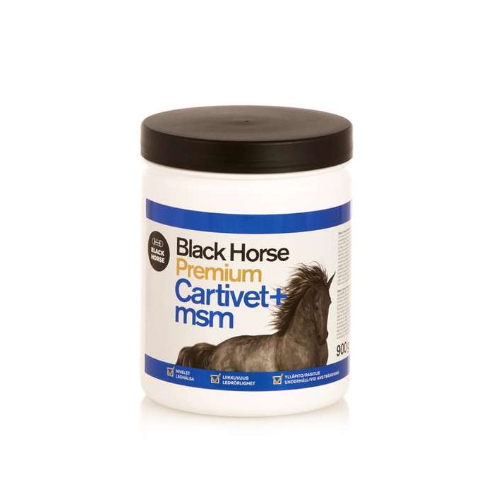 Black Horse Premium Cartivet+MSM on täydennysrehu hevosille joka sisältää mm. glukosamiinia, kondroitiinisulfaattia, kollageenia ja MSM:ää.