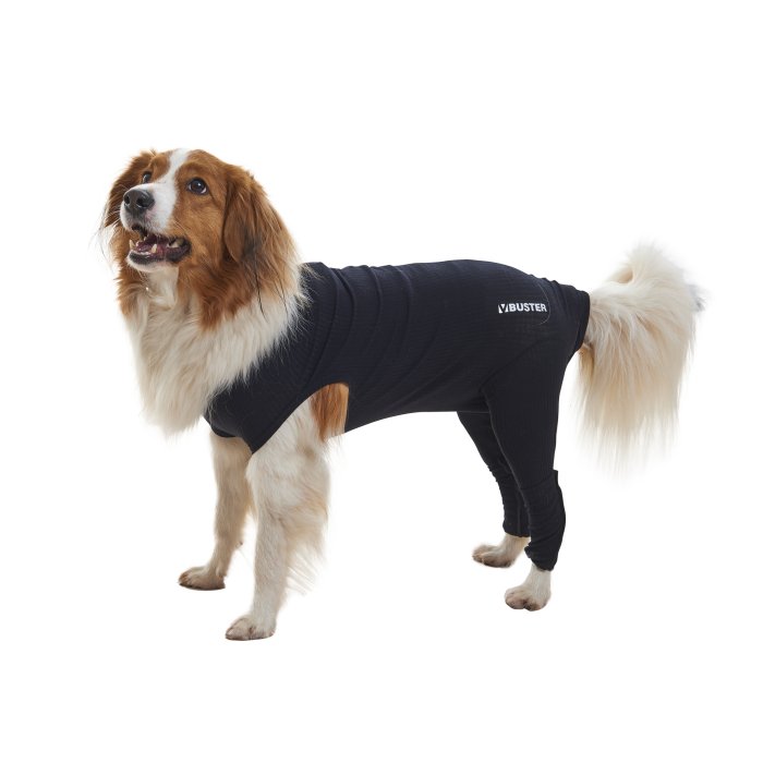 Buster Body suojahihoilla takajalkoihin. Mukava päällä ja helppo pukea. Voidaan käyttää esim. leikkauksen jälkeen tai ihon suojaamiseen.
