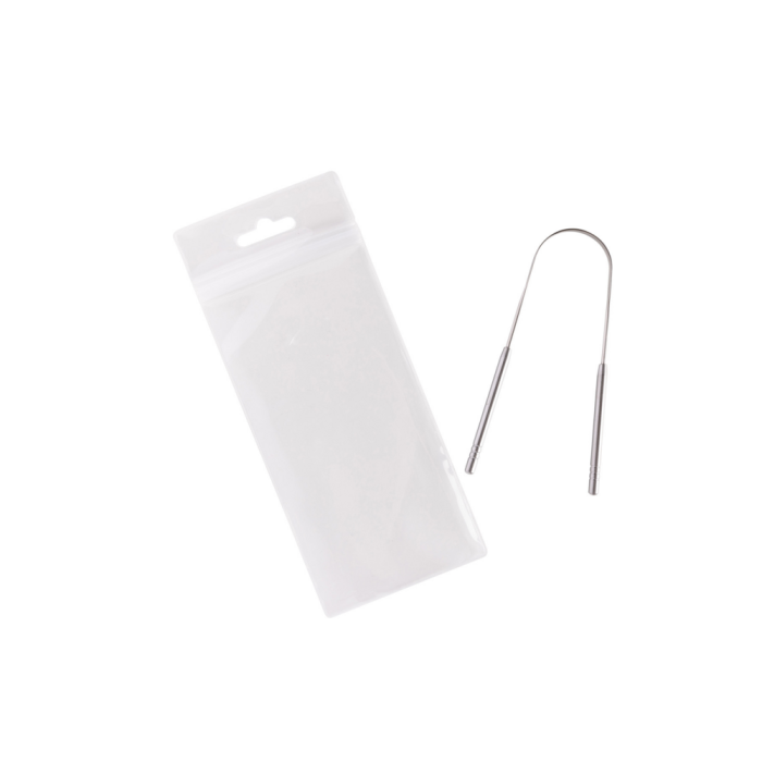 Kielenkaavin/-puhdistin kätevällä säilytyspussilla. Kielenkaavin hillitsee pahanhajuista hengitystä poistamalla kielen pinnalta hajua aiheuttavia bakteereja. Ruostumatonta terästä.