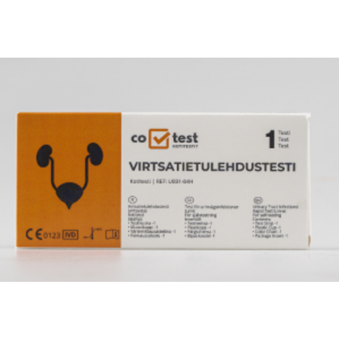 Virtsatietulehdustestillä näet helposti ja nopeasti (2 min) onko sinulla virtsatietulehdus. Co-Test virtsatietulehdustesti ei vaadi näytteen lähettämistä laboratorioon, kastat vain testiliuskan näytteeseen ja luet tuloksen verraten sitä tulosliuskaan.