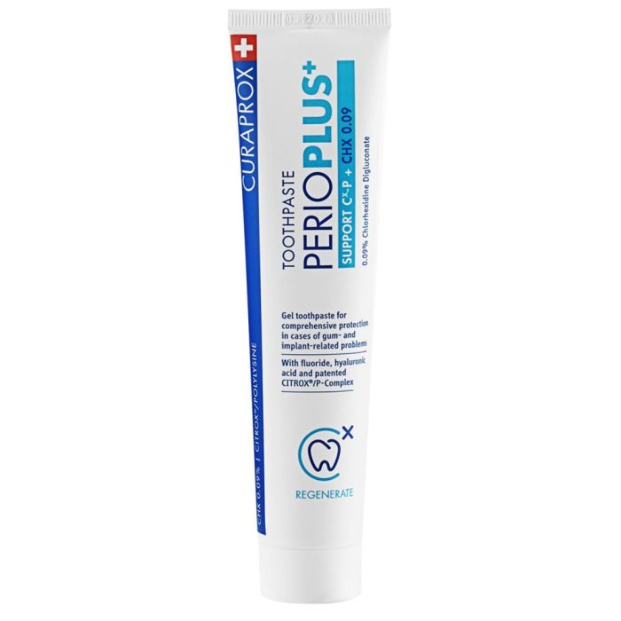 Curaprox Perio Plus+ Support hammastahna toimii klooriheksidiinihoidon tukena. Ei sisällä hoitoa heikentävää natriumlauryylisulfaattia (SLS). Sisältää ksylitolia. Sisältää fluoria (230 ppm F)