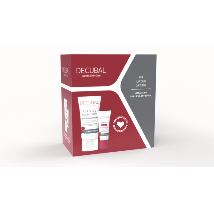 Decubal lahjapakkaus, joka sisältää Lips & dry spots balm 30 ml huulille ja muille kuiville ja karheille ihoalueille, sekä kevyesti sävytetyn Tinted lip balmin huulille.