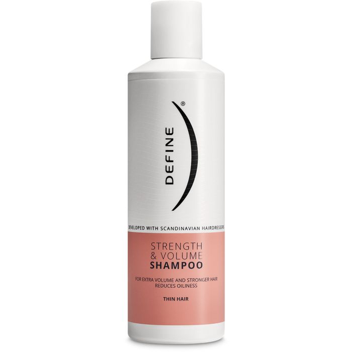 Define Strength & Volume Shampoo tuo hiuksiin tuuheutta samalla vahvistaen niitä. Se poistaa myös tehokkaasti rasvaisuutta ja muotoilutuotteiden jäämiä hiuksista ja hiuspohjasta. Define Strength & Volume Shampoo on vegaaninen, eikä se sisällä silikonia.