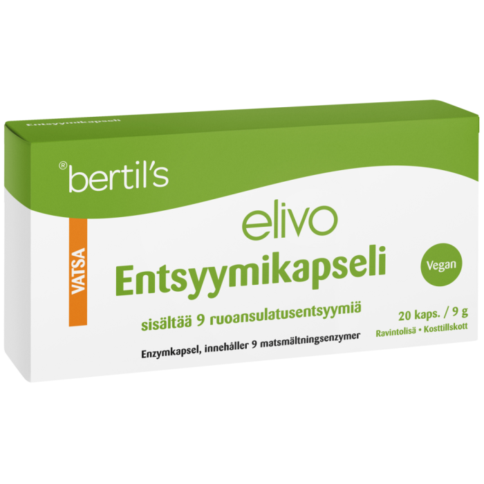 Elivo Entsyymikapseli sisältää yhdeksän eri ruuansulatusentsyymiä tukemaan ruuansulatusta. Entsyymit pilkkovat ravinnon proteiineja, rasvaa ja hiilihydraatteja imeytyvään muotoon.