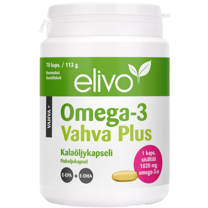 Omega-3-rasvahappoja 1020 mg (E-EPA-rasvahappoa 600 mg, E-DHA-rasvahappoa 300 mg)
