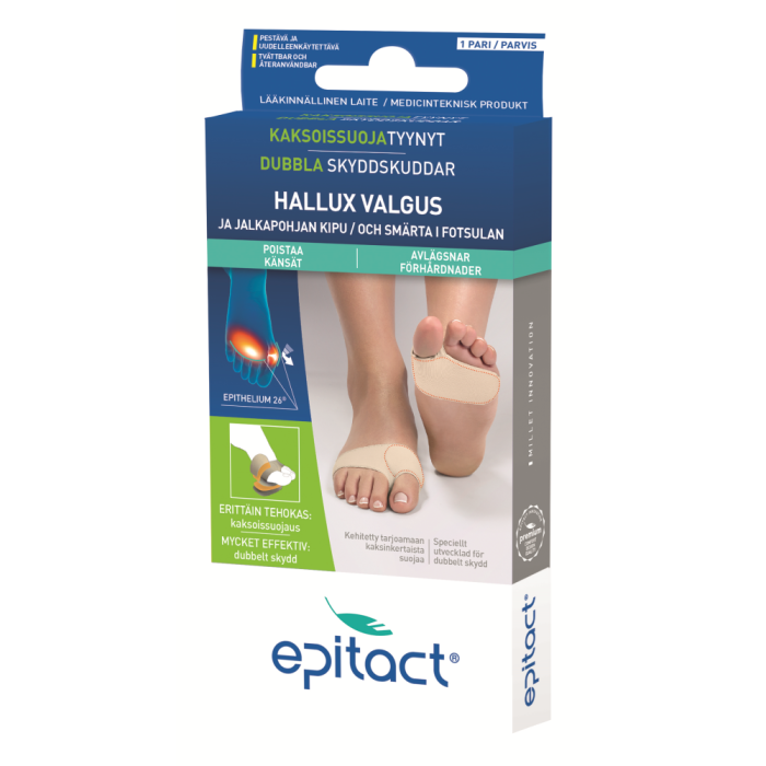 Kipua päkiässä ja vaivaisenluun kohdalla? Päkiän kipujen ehkäisy ja lievittäminen (esim. känsät, kuumotus, pitkäkestoinen seisominen). Vaivaisenluun hankautumisesta johtuvan kivun ehkäisy ja lievittäminen. Jalkaterapeuttien patentoima Epithelium 26 on erinomainen ”päkiän rasvapatjan korvike”. Hyvin ohuet tyynyt jakavat painetta, mutta vievät vähän tilaa. Niitä voi käyttää kaikentyyppisissä kengissä. https://epitact.fi/
