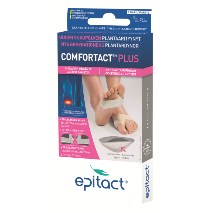 Kipua päkiässä? Suojaavat päkiää vähentämällä siihen kohdistuvaa painetta ja lievittävät kipua. EPITHELIUM 26® -silikonigeelistä valmistettu osa tuntuu kuin kuulilta. Se on kehitetty muotoutumaan miellyttävästi päkiän ympärille ja jakamaan painetta. Ainutlaatuisen muotoilun ja materiaalin tasaisen jouston ansiosta jalalle asettuva paino on optimaalinen. Konepesu 30°C:n lämpötilassa mukana toimitettavassa pesupussissa tai käsinpesu (hankaamatta). https://epitact.fi/