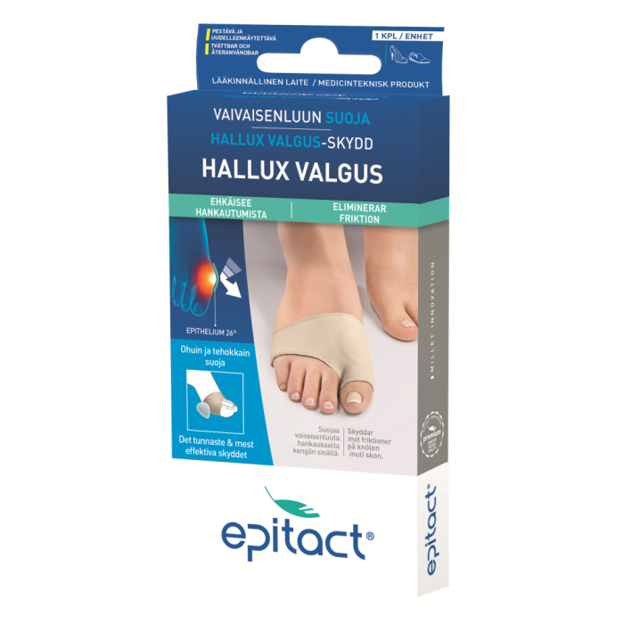 Haittaako vaivaisenluun kipu esimerkiksi kävellessä? Vaivaisenluun suoja ehkäisee liialliseen paineeseen ja hankaukseen liittyvää vaivaisenluun (hallux valgus) aiheuttamaa kipua. Suoja on pienikokoinen ja sopii käytettäväksi tavallisesti käyttämissäsi kengissä. Vaivaisenluulla tarkoitetaan jalkaterän ongelmaa, jossa ukkovarvas kääntyy muihin varpaisiin päin. VINKKI! Jos isovarvasta pystyy yhä liikuttamaan, suosittelemme joustavan, päiväkäyttöön tarkoitetun EPITACT®-oikaisijan käyttämistä vaivaisenluun hoitoon. Se korjaa asentopoikkeamaa, rajoittaa vaivaisenluun etenemistä, lievittää nivelkipua ja estää vaivaisenluun hankautumista. Konepesu 30°C:n lämpötilassa mukana toimitettavassa pesupussissa tai käsinpesu (hankaamatta). Anna kuivua itsekseen. Ei saa silittää. https://epitact.fi/
