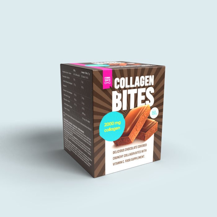 Maistuvat ja rapeat suklaapalat päivittäiseen käyttöön iholle ja nivelille*. Sisältää tutkittuja Fortigel® B -ja Verisol® B -kollageeneja ja C-vitamiinia. Erinomainen vaihtoehto ihmisille, joille on tärkeätä, että kollageenilisä on hyvänmakuinen ja helppo nauttia.